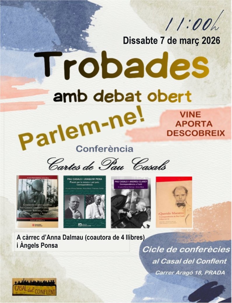 Anna Dalmau, coautora dels quatre volums de correspondència de Pau Casals, conversarà amb l’exconsellera de cultura de la Generalitat Àngels Ponsa sobre la figura de Pau Casals i el que aprenem a partir de les cartes/lletres que va intercanviar al llarg de la seva vida amb intel·lectuals, músics, poetes, polítics i altres personalitats rellevants del segle passat. La presentació s’enmarca dins de les conferències que organitza periòdicament el Casal de Conflent. L’ acte tindrà lloc dissabte 7 de març a les 11:00.